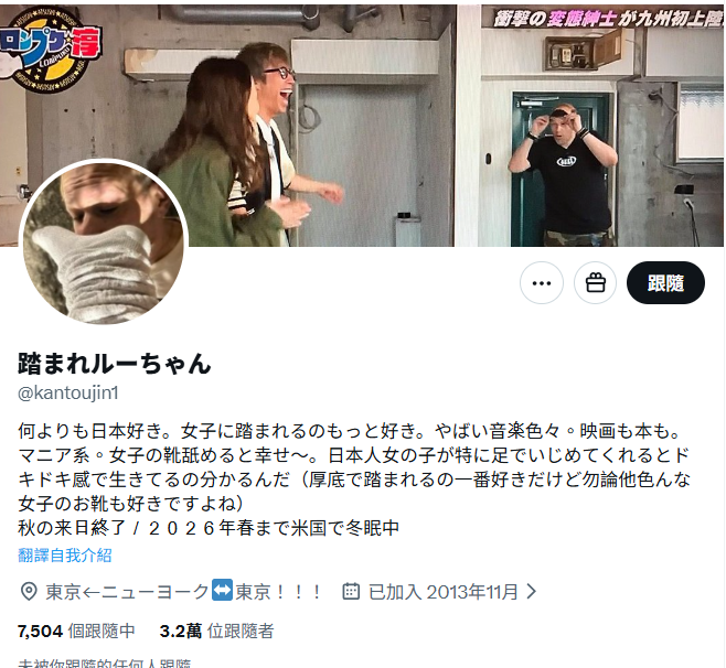 該名男子在X也常分享被踩的照片,並說最喜歡日本,更喜歡被女生踩,舔女生的鞋子就會覺得幸福,那種心跳感讓覺得自己活著,最喜歡被厚底鞋踩,每年春秋兩季都會到日本,今年秋季的訪日行程已結束,會在美國等到2026年春天再度前往日本。