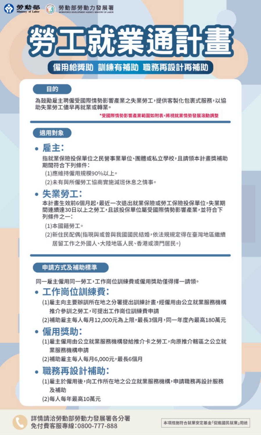 桃竹苗分署長賴家仁表示,「僱用獎助計畫」鼓勵雇主積極僱用經公立就業服務機構推介的失業勞工,凡符合資格的雇主,以不定期契約、按月計酬全時工作僱用,每人每月可獲新臺幣6,000 元補助,最長可請領六個月,協助受國際情勢影響產業而失業的勞工快速重返職場,並鼓勵雇主積極僱用相關勞動力,促進就業機會,確保勞動市場的長期穩定。相關資訊及申請流程,請上台灣就業通-勞工就業通計畫專區( https://reurl.cc/QV5Kxq )查詢,或撥打免付費客服專線 0800-777-888 洽詢。