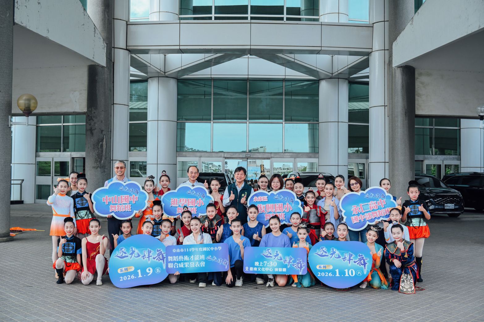 「逐光肆舞」臺南市114學年度舞蹈藝才班聯合展將於1月9日及10日晚間7時30分,在臺南文化中心演藝廳盛大登場。教育局長鄭新輝率領永仁高中國中部、中山國中、永康區復興國小及進學國小4校舞蹈班校長與學生共同拍攝宣傳影片,為年度舞蹈盛事揭開序幕。