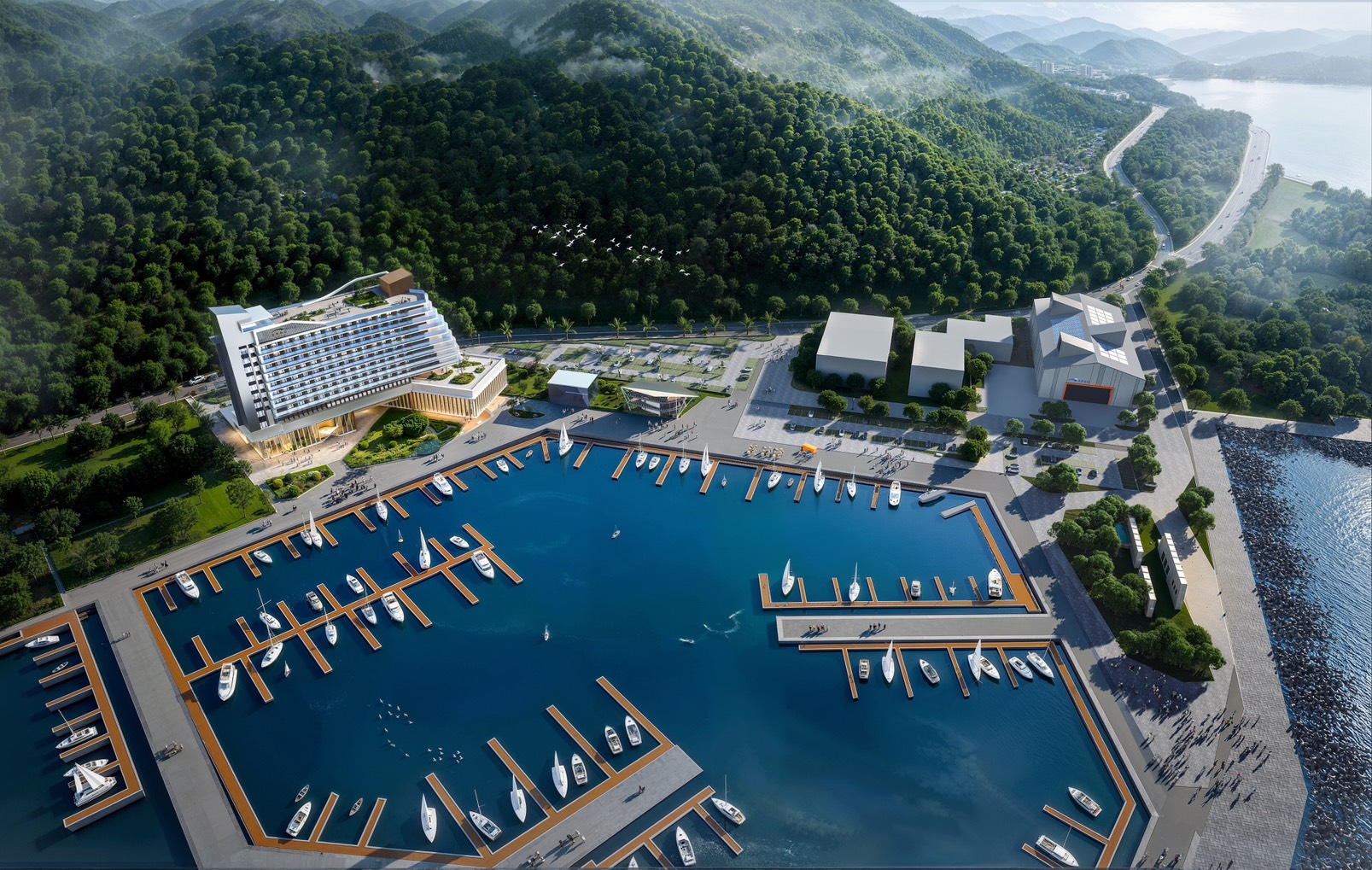 在水域設施方面,將設置超過300個泊位,其中包含約180席水域泊位與150席乾式碼頭,成為全台規模最大的乾式泊船設施,可有效因應東北季風與颱風氣候,降低船舶損耗;同時,也將引進飯店、商場及海洋學校,推動遊艇與帆船教育、證照培訓,深化全民海洋素養。