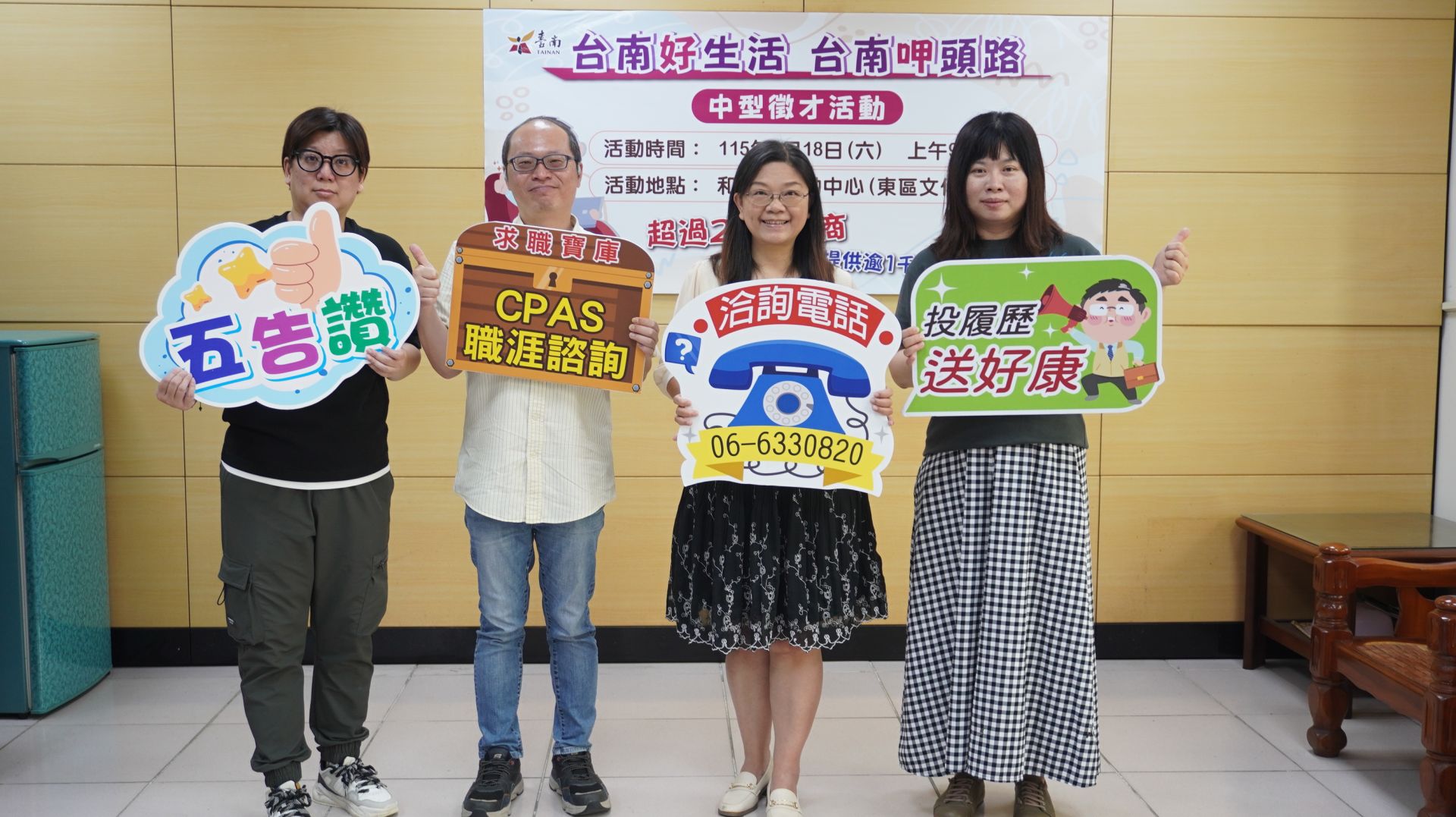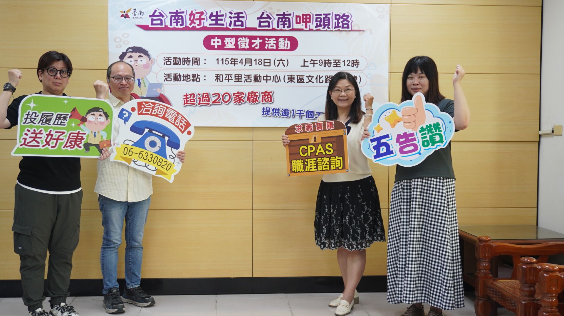 為打造「希望家園」的施政願景,勞工局今(115)年第1場「台南好生活 台南呷頭路」中型徵才活動將於4月18日(週六)上午9時至12時在東區和平里活動中心辦理,有台灣矽科宏晟科技、台灣穗高科技、小北百貨、官田鋼鐵、全家便利商店、臺南紡織、興南汽車客運、統聯汽車客運、台灣東特、東信輕金屬、榮眾科技、全聯實業、璨揚企業等27家廠商,超過1,000個工作機會,鼓勵有求職需求的民眾參加。