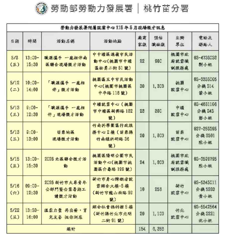隨著畢業季與暑期工讀旺季到來,企業用人需求明顯升溫,為協助求職民眾即時掌握職缺資訊、縮短媒合時間,勞動部勞動力發展署桃竹苗分署於5月份密集辦理徵才活動,共規劃7場次,集結154家優質企業參與,釋出逾6,300個工作機會;職缺涵蓋正職、兼職及暑期工讀,產業橫跨製造業、服務業及科技產業,提供不同族群多元選擇,協助青年、轉職者及二度就業民眾順利銜接職場。