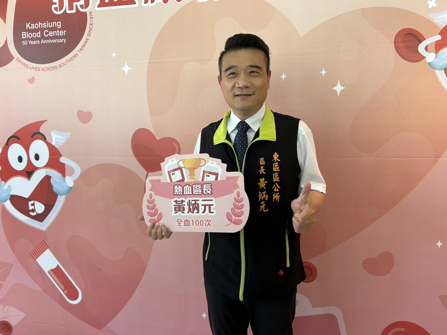 東區區長黃炳元在任職警察即轉任民政體系之後,就連續累計全血捐血達100次,黃炳元說他非常感謝捐血中心的表揚,他自己從民國77年開始,就捐了100次血,其實30幾年捐了100次血其實不多,但這都是一種無私的奉獻。