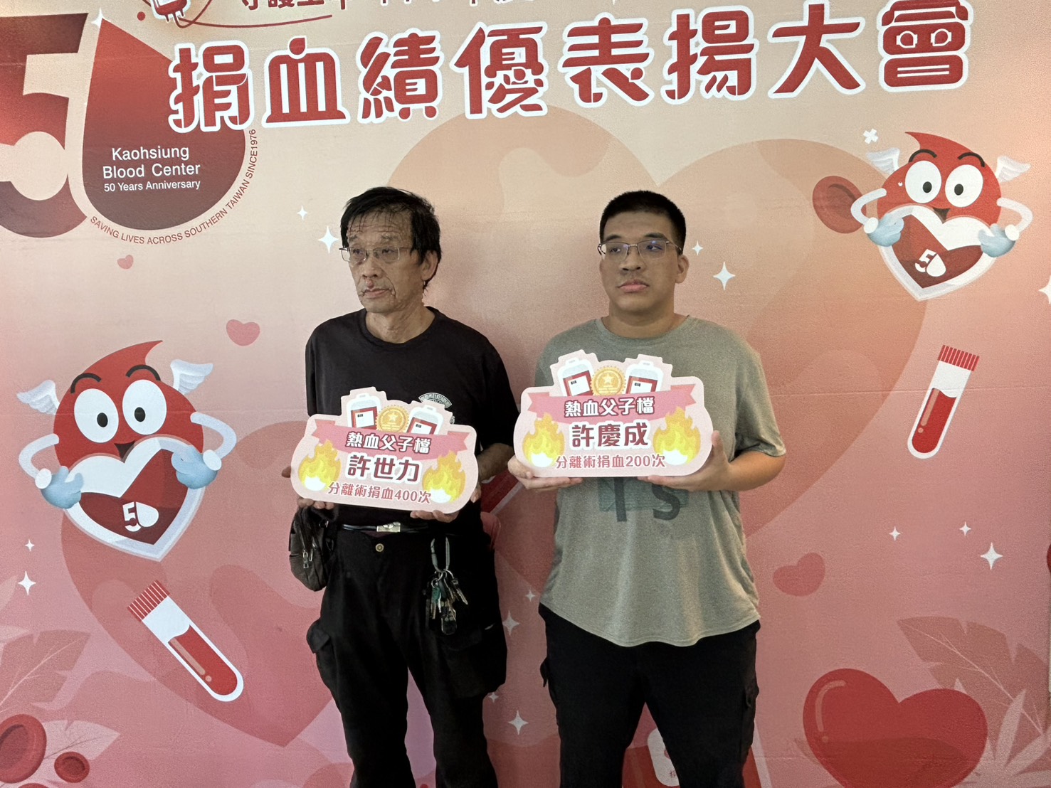 ▲許世力(左)與許慶成(右)父子長期投入捐血行列,分別累計達400次與200次,以行動傳承助人精神,成為捐血典範。(記者黃雋淮 攝)