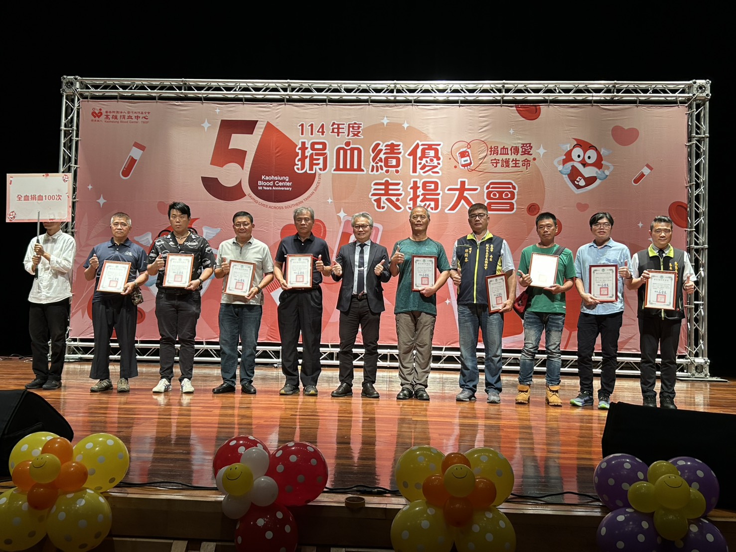 高雄捐血中心指出,隨著台灣邁入高齡化社會,用血需求逐年增加,但年輕族群捐血人口下降,血源面臨壓力,期盼透過表揚活動鼓勵更多民眾加入定期捐血行列。114年度共表揚捐血百次以上民眾3,633人、績優學校10所、績優部隊1個單位,以及年度募血逾1,000袋之機關團體69個單位,另有6個特殊貢獻團體獲獎;全年血液募集量達765,476單位,有效支援醫療用血需求。