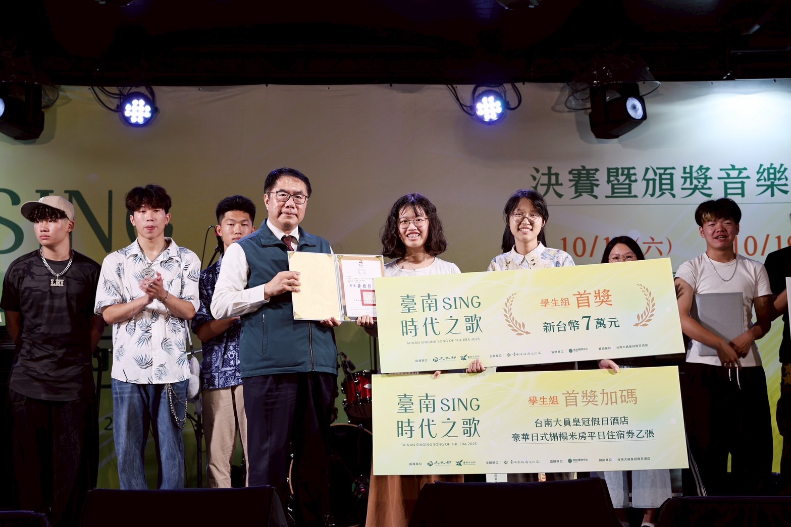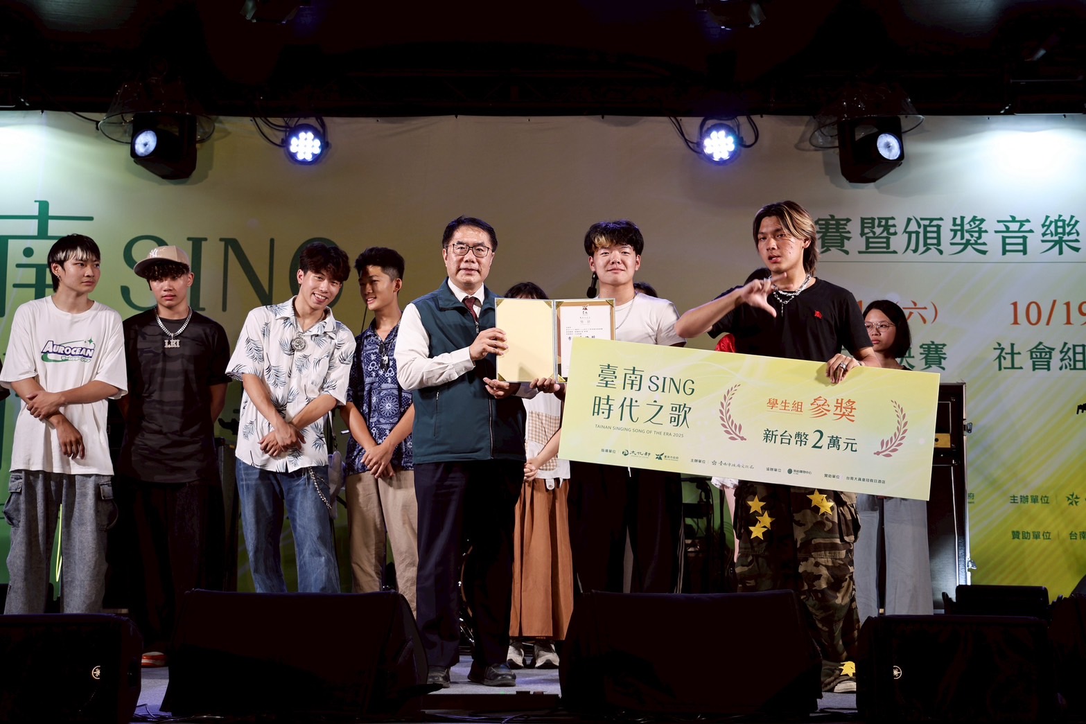 由台南市政府文化局主辦「2025台南sing時代之歌」原創音樂競賽,最終入圍的20組優秀創作者將於今明兩日(10/18-19)晚間在南紡購物中心1樓A2廣場展開決賽暨頒獎音樂盛會。台南市長黃偉哲今(18日)晚特別驚喜現身為學生組得獎者頒獎。